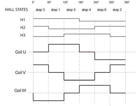 Figure 4: Coil-energizing sequence for one electrical revolution of a three-phase BLDC motor. (Courtesy of Atmel.)