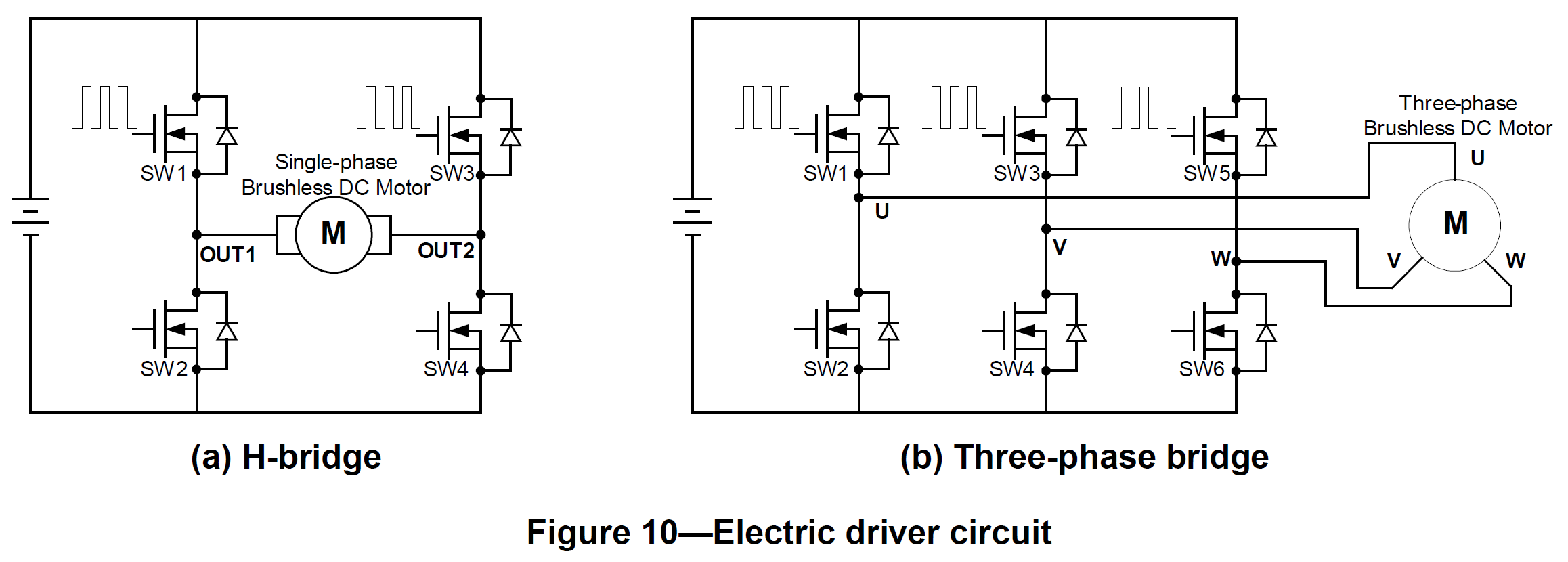Brushless DC motors use electric switches to realize current commutation, and thus continuously rotate the motor. These electric switches are usually connected in an H-bridge structure for a single-phase BLDC motor, and a three-phase bridge structure for a three-phase BLDC motor shown in Figure 10. Usually the high-side switches are controlled using pulse-width modulation (PWM), which converts a DC voltage into a modulated voltage, which easily and efficiently limits the startup current, control speed and torque. Generally, raising the switching frequency increases PWM losses, though lowering the switching frequency limits the system’s bandwidth and can raise the ripple current pulses to the points where they become destructive or shut down the BLDC motor driver.[4]