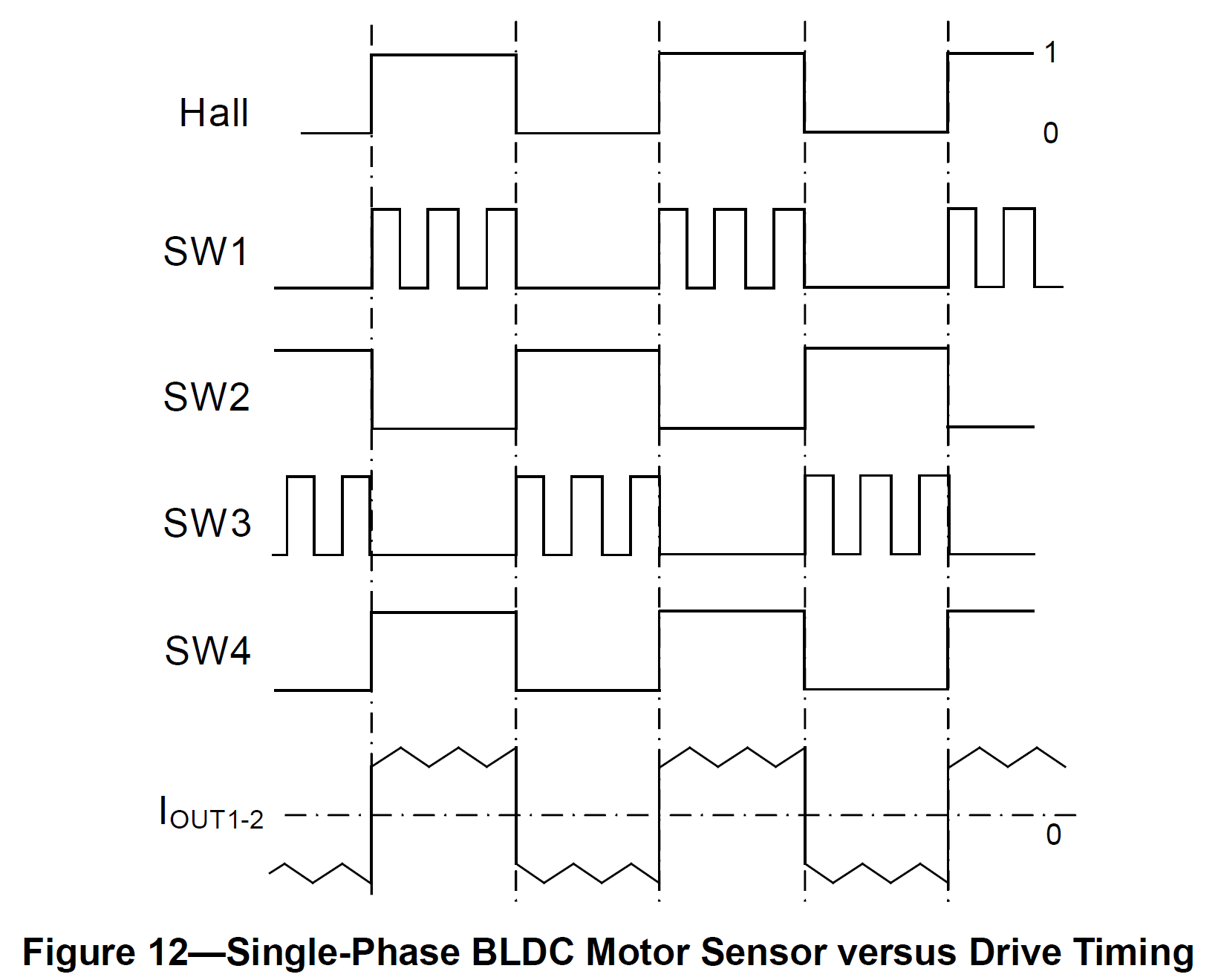 Figure 12 shows an example of Hall sensor signals with respect to switch drive signals and armature current.[5] The armature current exhibits a saw tooth waveform due to PWM control. The applied voltage, switching frequency, and the PWM duty cycle are three key parameters to determine the speed and the torque of the motor.