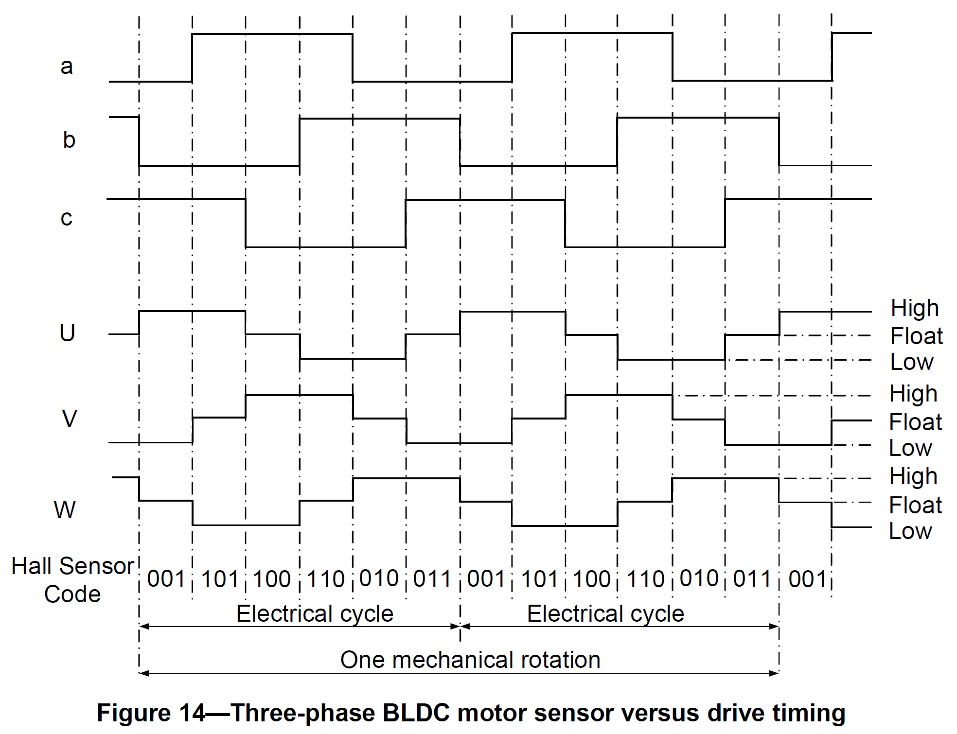 Figure 14 shows the timing diagrams where the phase windings—U, V, and W—are either energized or floated based on the Hall sensor signals a, b, and c. This is an example of Hall sensor signal having a 120° phase shift with respect to each other, where the motor rotates counter-clockwise. Producing a Hall signal with a 60° phase shift or rotating the motor clockwise requires a different timing sequence. To vary the rotation speed, use pulse width modulation signals on the switches at a much higher frequency than the motor rotation frequency. Generally, the PWM frequency should be at least 10 times higher than the maximum motor rotation frequency. Another advantage of PWM is that if the DC bus voltage is much higher than the motor-rated voltage, so limiting the duty cycle of PWM to meet the motor rated voltage controls the motor.