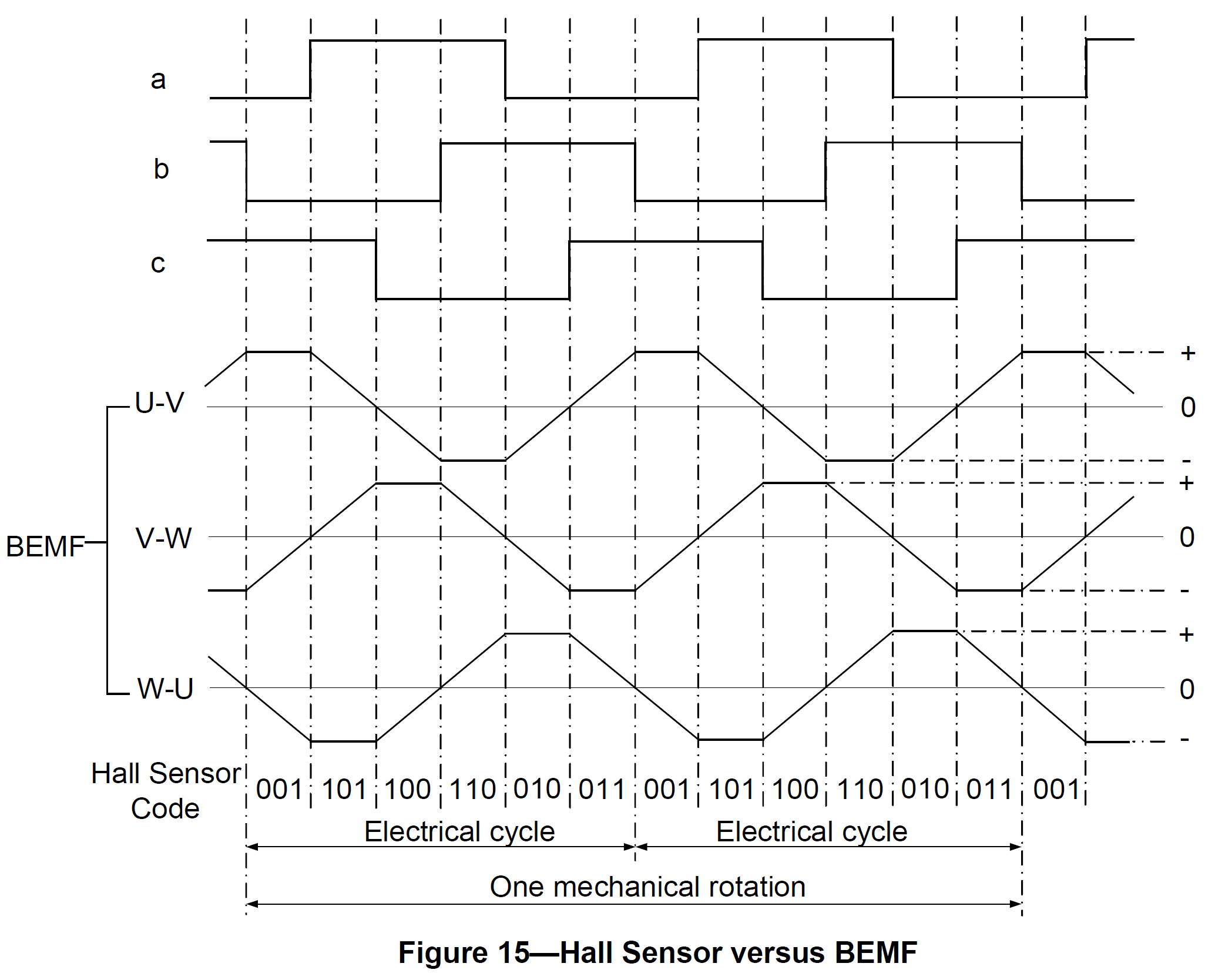 However, sensors cannot be used in applications where the rotor is in a closed housing and requires minimal electrical entries, such as a compressor or applications where the motor is immersed in a liquid. Therefore, the BLDC sensorless driver monitors the BEMF signals instead of the position detected by Hall sensors to commutate the signal. The relationship between the sensors’ output and the BEMF is shown in Figure 15. The sensor signal changes state when the voltage polarity of the BEMF crosses from positive to negative or from negative to positive. The BEMF zero-crossings provides precise position data for commutation.[6]