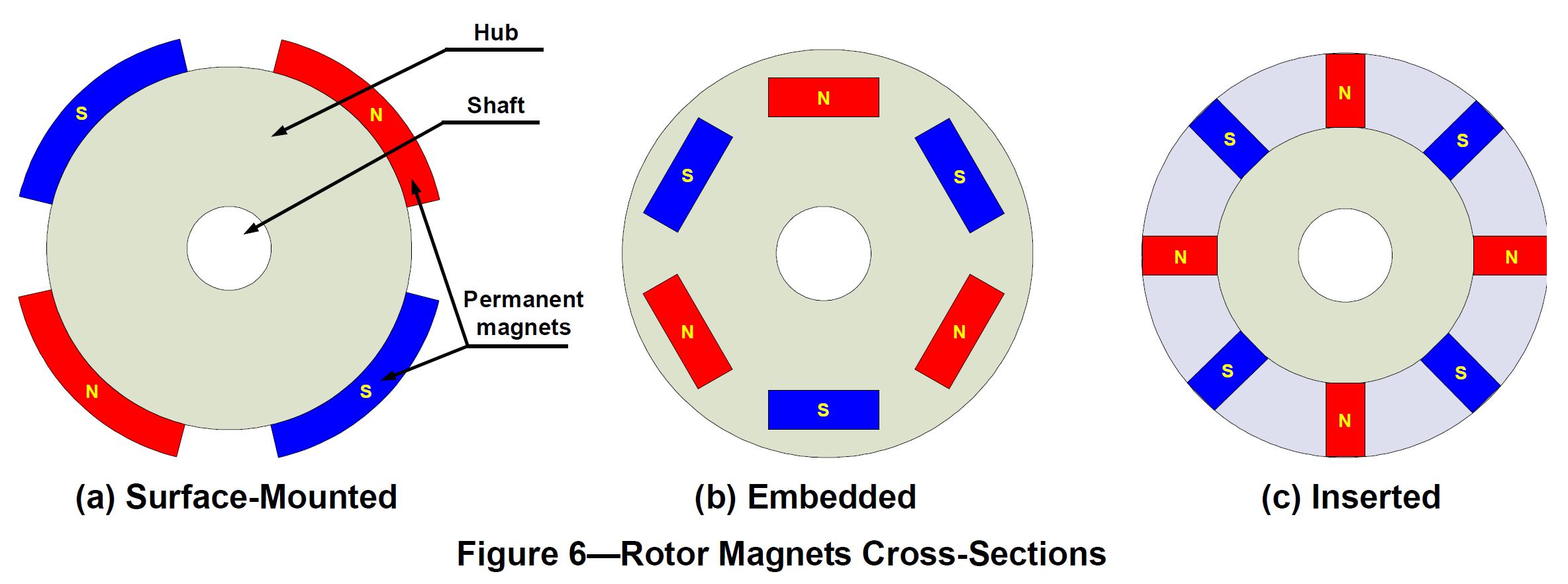 A rotor consists of a shaft and a hub with permanent magnets arranged to form between two to eight pole pairs that alternate between north and south poles. Figure 6 shows cross sections of three kinds of magnets arrangements in a rotor.
