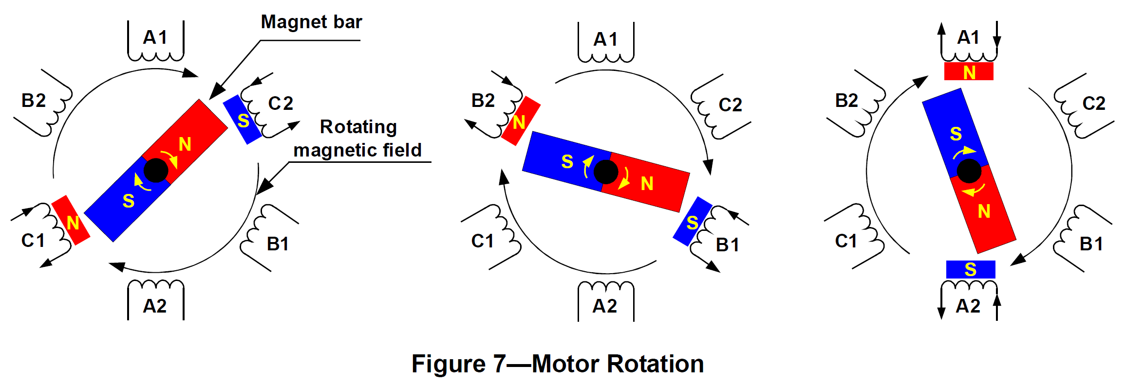 A single-phase motor has one stator winding—wound either clockwise or counter-clockwise along each arm of the stator—to produce four magnetic poles as shown in Figure 5(a). By comparison, a three-phase motor has three windings as shown in Figure 5(b). Each phase turns on sequentially to make the rotor revolve.