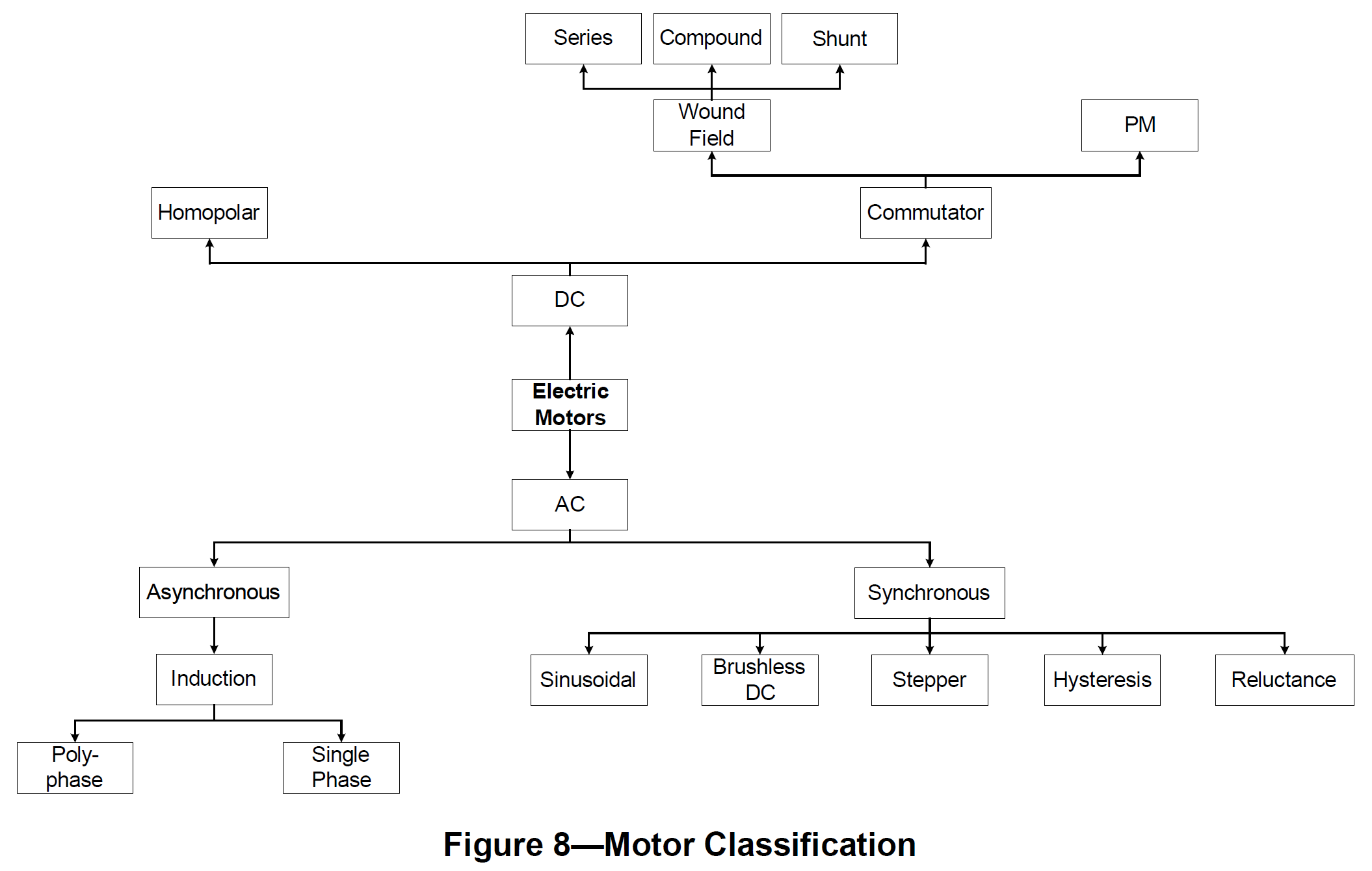 There are multiple varieties of electric motor differentiated by structure and signal type, but are generally based on the same principle as the three-phase motor previously discussed. Figure 8[2] diagrams the different motors organized by classifying features.