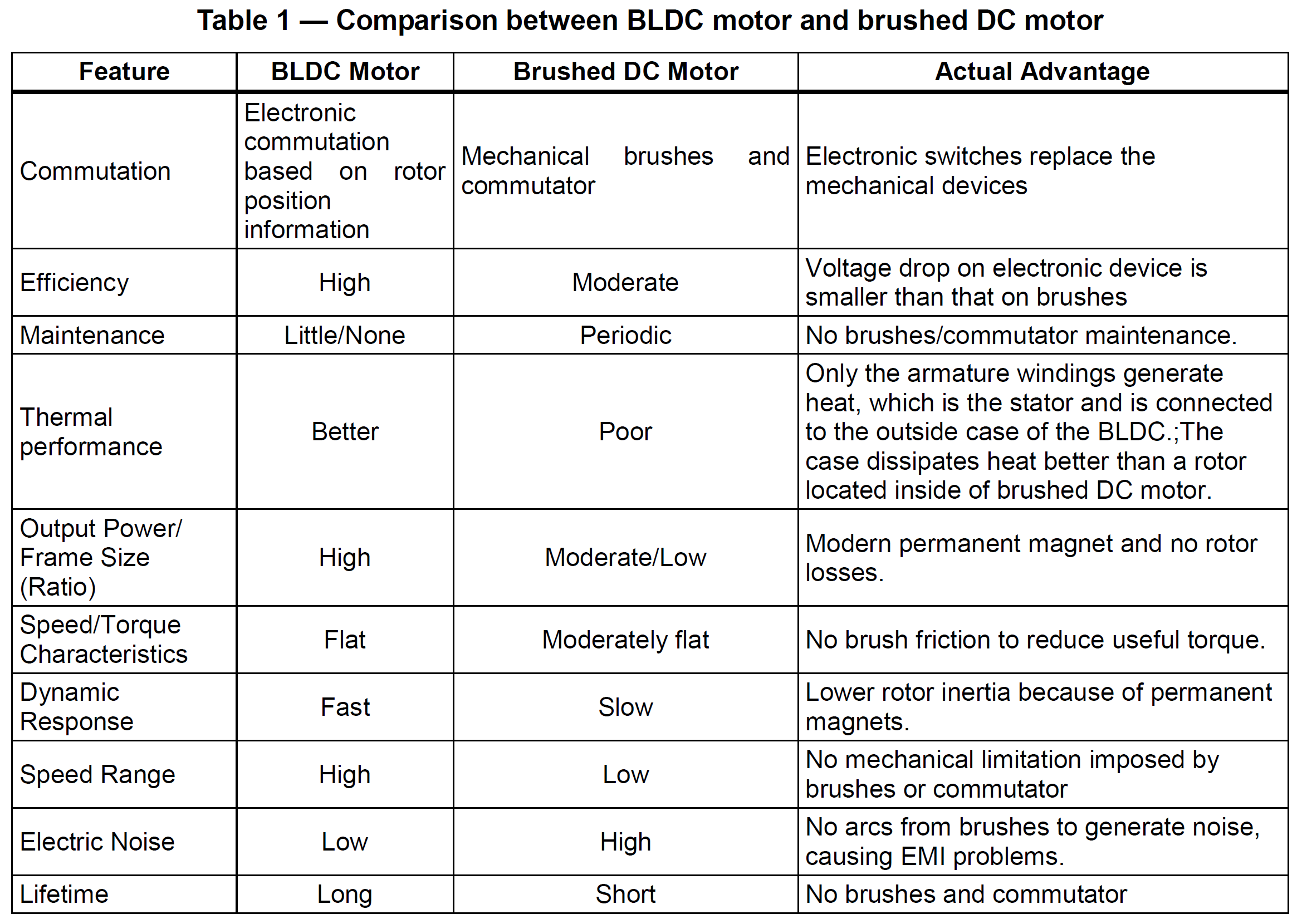 The BLDC motor has several advantages over other motors. Table 1 and Table 2 summarize the advantages of the BLDC motor when compared against a brushed DC motor and an AC induction motor.[1][3]