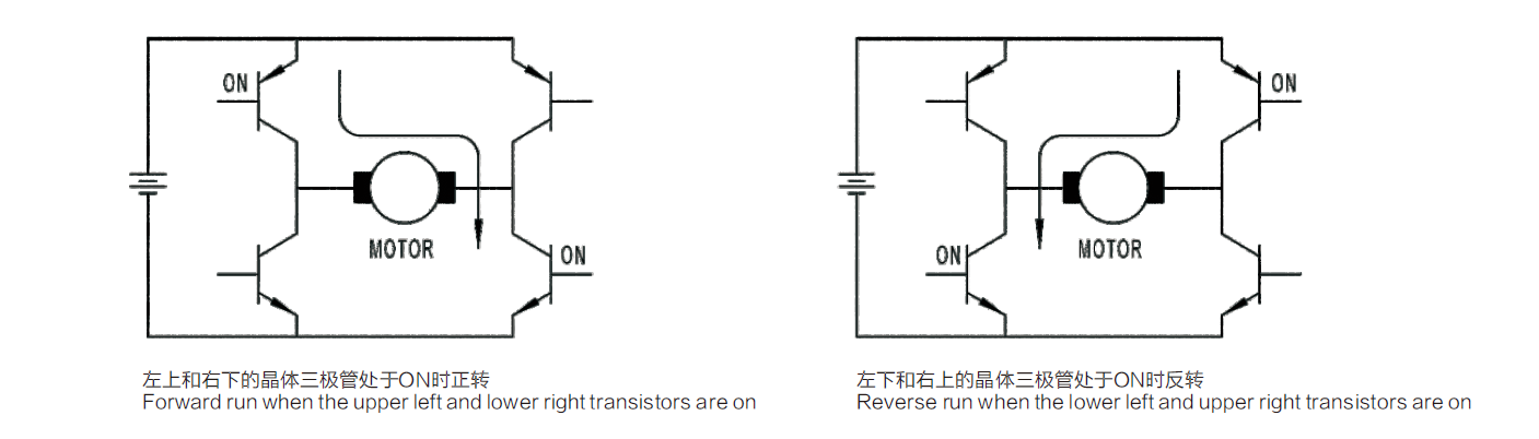 Bidirectional motor driving is achieved by switching the H-type bridge circuit by use of NPN and PNP transistors
