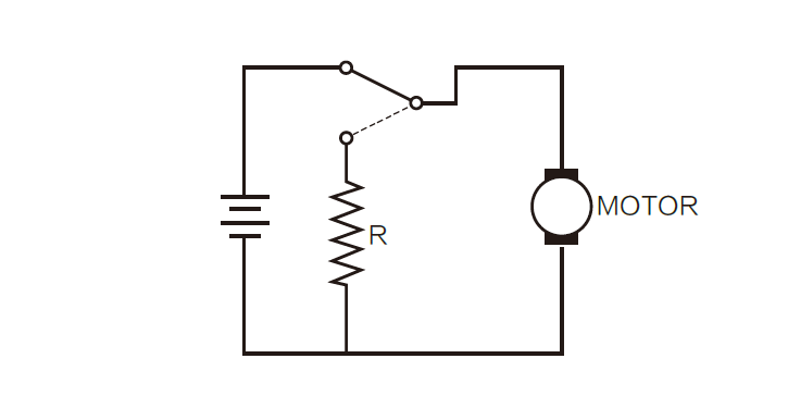 A method to force the terminals of the DC motor brake by short circuit. This method can shorten the motor's brake time and provides powerful braking control. (Maximum braking when R = 0)