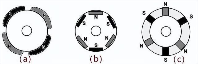 根据应用,极数可以在2到8个之间变化,北极(N)和南极(S)交替放置。下图显示了磁极的三种不同布置。
