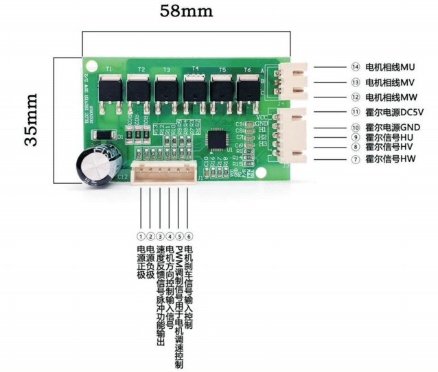 2.本驱动器是有霍尔无刷电机控制,电机的霍尔信号HU 、HV 、HW与电机三相线M U 、M V 、MW 必须对应驱动器的各个端口,否则会造成无法启动的可能。
